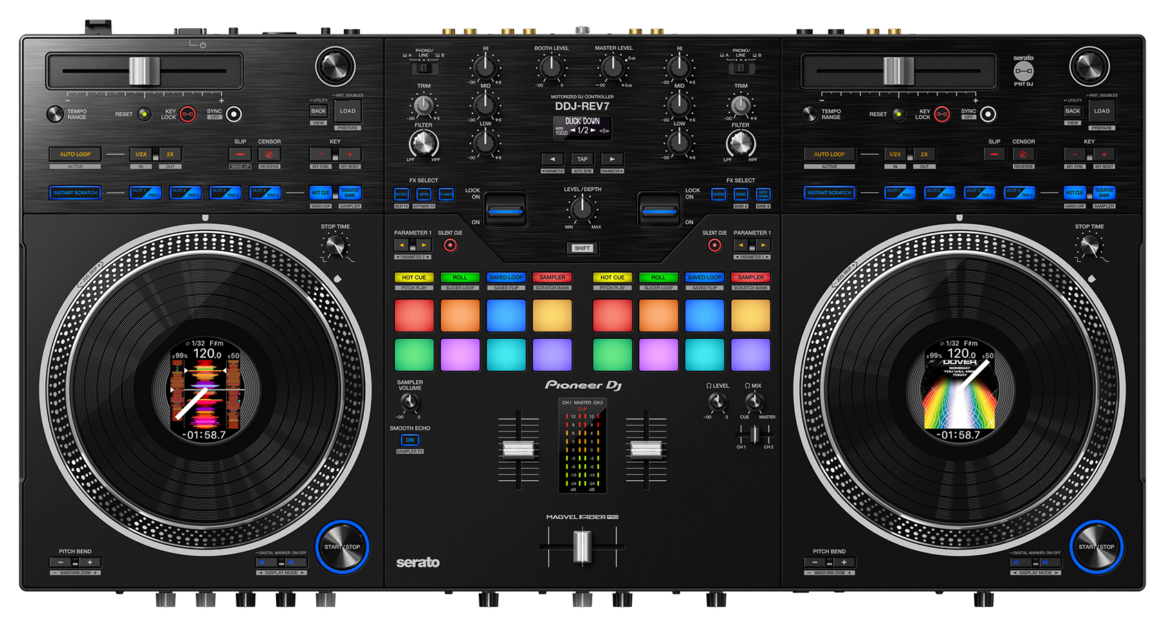 No centro de cada deck do DDJ-REV7 encontra o novo jog wheel de 7 polegadas motorizado, que oferece a mesma estabilidade de rotação de um gira-discos de 12 polegadas e foi concebido para que pareça estar a reproduzir com discos reais. A placa superior de acrílico apresenta um acabamento com uma textura tipo vinil para agarrar sem esforço, podendo optar entre uma configuração de torque elevado ou baixo e usar as duas capas protetoras incluídas no interior de cada deck – que se encaixam perfeitamente dentro do jog wheel – para encontrar a quantidade de fricção da sua preferência. Alterne entre uma rotação de 33⅓ ou 45 rpm, o que for mais do seu agrado, e use a configuração Stop Time para ajustar quanto tempo demora para a música parar quando pressiona o botão Pause. Pode pará-la imediatamente ou abrandá-la gradualmente como se tivesse desligado a alimentação num deck analógico.